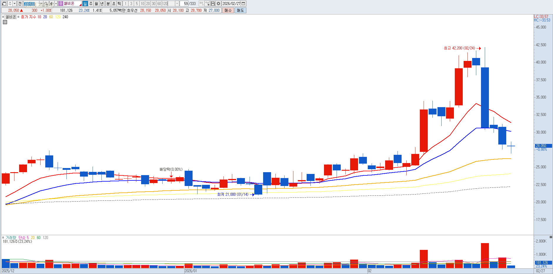 수급적으로도 2026년 초 주가가 역사적 신고가 부근에 도달하면서 차익 실현 매물이 쏟아질 수 있는 '고점 경계 구간'에 진입했습니다. 아직 흑자 전환을 달성하지 못한 바이오 기업 특성상, 임상 최종 결과나 승인 절차에서의 사소한 지연 소식만으로도 주가는 큰 폭의 하락 변동성을 보일 수 있습니다. 특히 부채 비율이 높은 재무적 취약성은 외부 자금 조달에 대한 우려를 지속시키며 주가 상단을 제한하고 있습니다. 따라서 현재의 장밋빛 전망보다는 리스크 관리를 위해 수익을 확정하는 보수적인 대응이 필요한 시점입니다. 매도의견입니다. |
