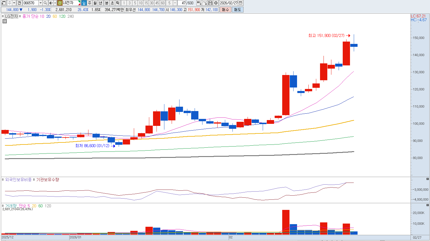 특히 가전의 계절적 비성수기 진입 시마다 반복되는 실적 변동성은 대형주로서의 안정성을 훼손하며, 플랫폼 사업으로의 전환 시도 또한 글로벌 빅테크와의 경쟁에서 뚜렷한 해자를 보여주지 못하고 있어 밸류에이션 재평가는 시기상조라는 평가가 지배적입니다. 매도의견입니다. |