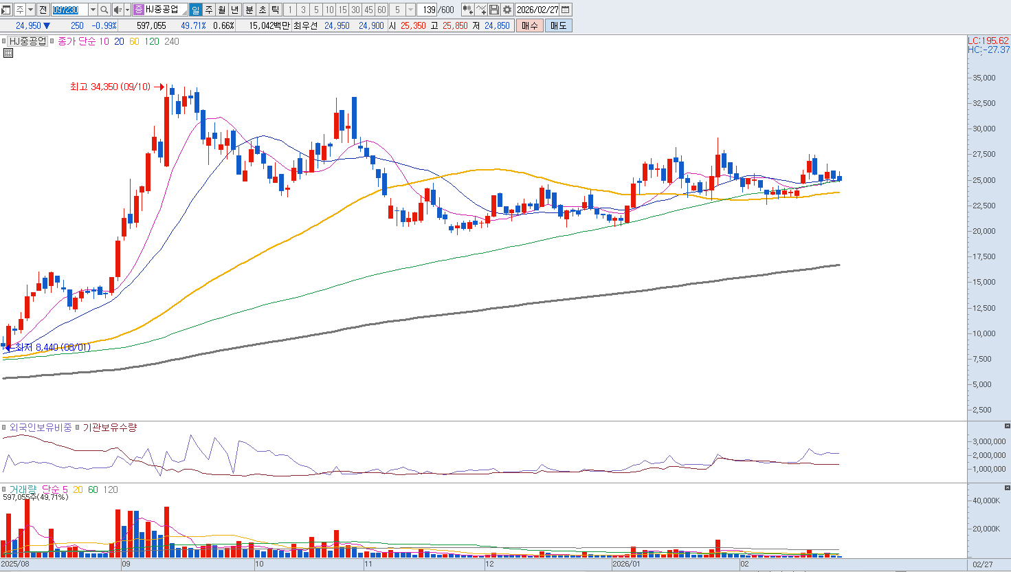 HJ중공업은 건설 부문에서 중소형 현장 위주의 포트폴리오를 보유하고 있어, 국내 부동산 경기 침체와 원자재 가격 상승에 가장 취약한 구조를 보입니다. 2026년에도 해결되지 않은 지방 미분양 문제와 공사비 정산 분쟁은 동사의 현금 흐름을 지속적으로 압박하고 있습니다.