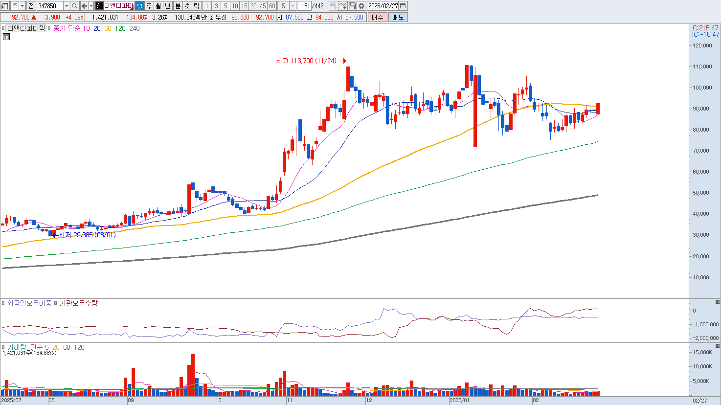 하지만 냉정한 관점에서 볼 때, 현재의 가치는 미래의 기술료 수익을 과도하게 선반영하고 있다는 리스크가 존재합니다. MASH 치료제 시장은 마드리갈의 '레즈디프라' 승인 이후 경쟁이 더욱 치열해지고 있으며, 디앤디파마텍의 후보물질인 DD01이 조직 생검 결과에서 경쟁사 대비 압도적인 섬유화 개선 효과를 입증하지 못할 경우 밸류에이션의 가파른 하향 조정이 불가피합니다. 또한 기술 이전 이후의 임상 주도권이 파트너사로 넘어가면서 발생할 수 있는 개발 일정의 변동성과, 경구용 비만약 시장에 진입하는 노보 노디스크 등 거대 공룡들과의 속도전은 동사가 해결해야 할 무거운 과제입니다. 따라서 현재는 임상 데이터의 '결과값'이 확인되기 전까지는 추가적인 상승 동력이 제한적일 수 있는 관망 구간으로 판단됩니다. 신고가 경신시마다 비중 축소 의견입니다. |