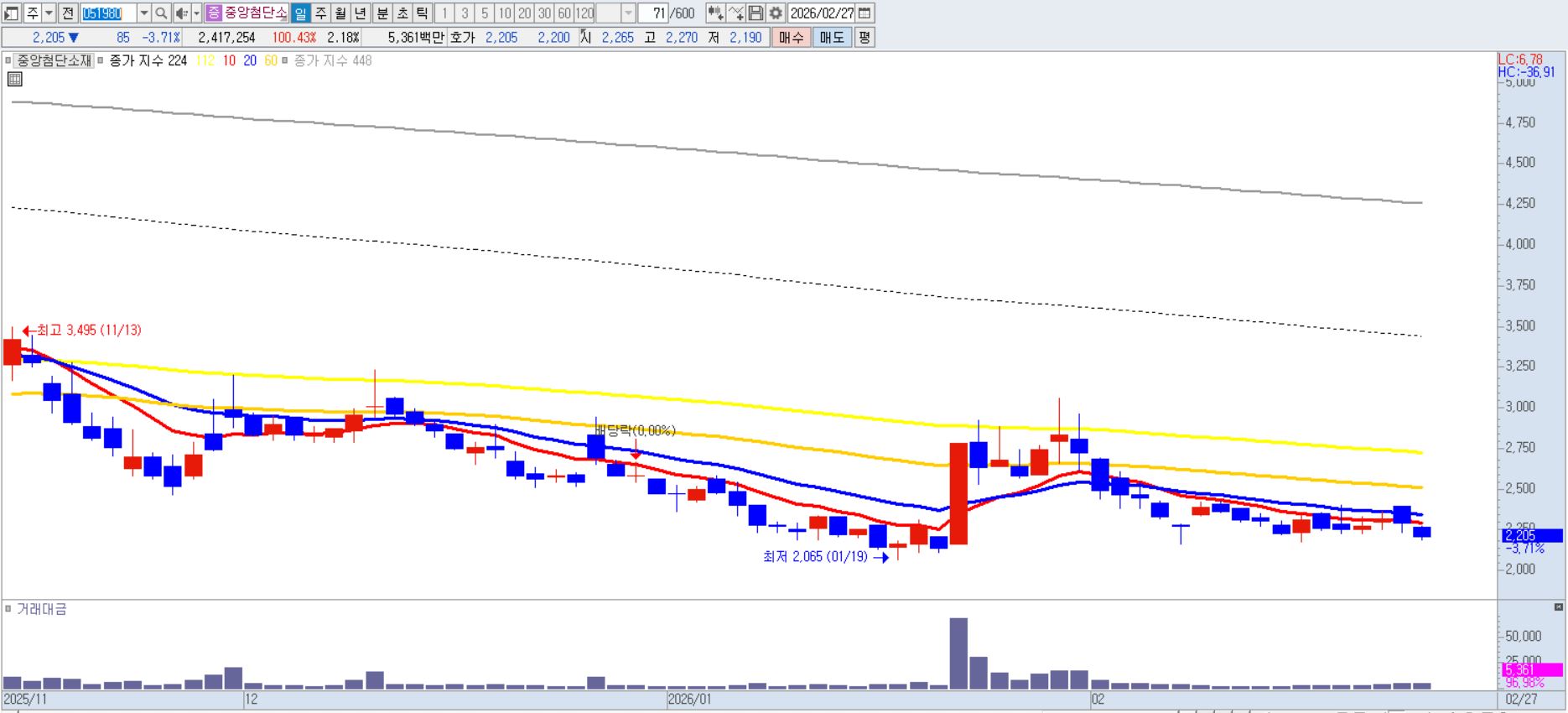 동사의 주력인 리튬염 사업은 원재료 가격 변동에 극도로 취약하며, 엔캠의 해외 공장 스케줄에 따라 실적이 춤을 추는 불투명한 변동성을 안고 있습니다. 2026년 현재 리튬 시장이 수급 적자로 전환될 것이라는 낙관론이 나오고 있음에도 불구하고, 실제 중앙첨단소재가 보유한 유통 및 단순 가공 기반의 비즈니스 모델은 부가가치를 창출하는 데 한계가 명확합니다.
