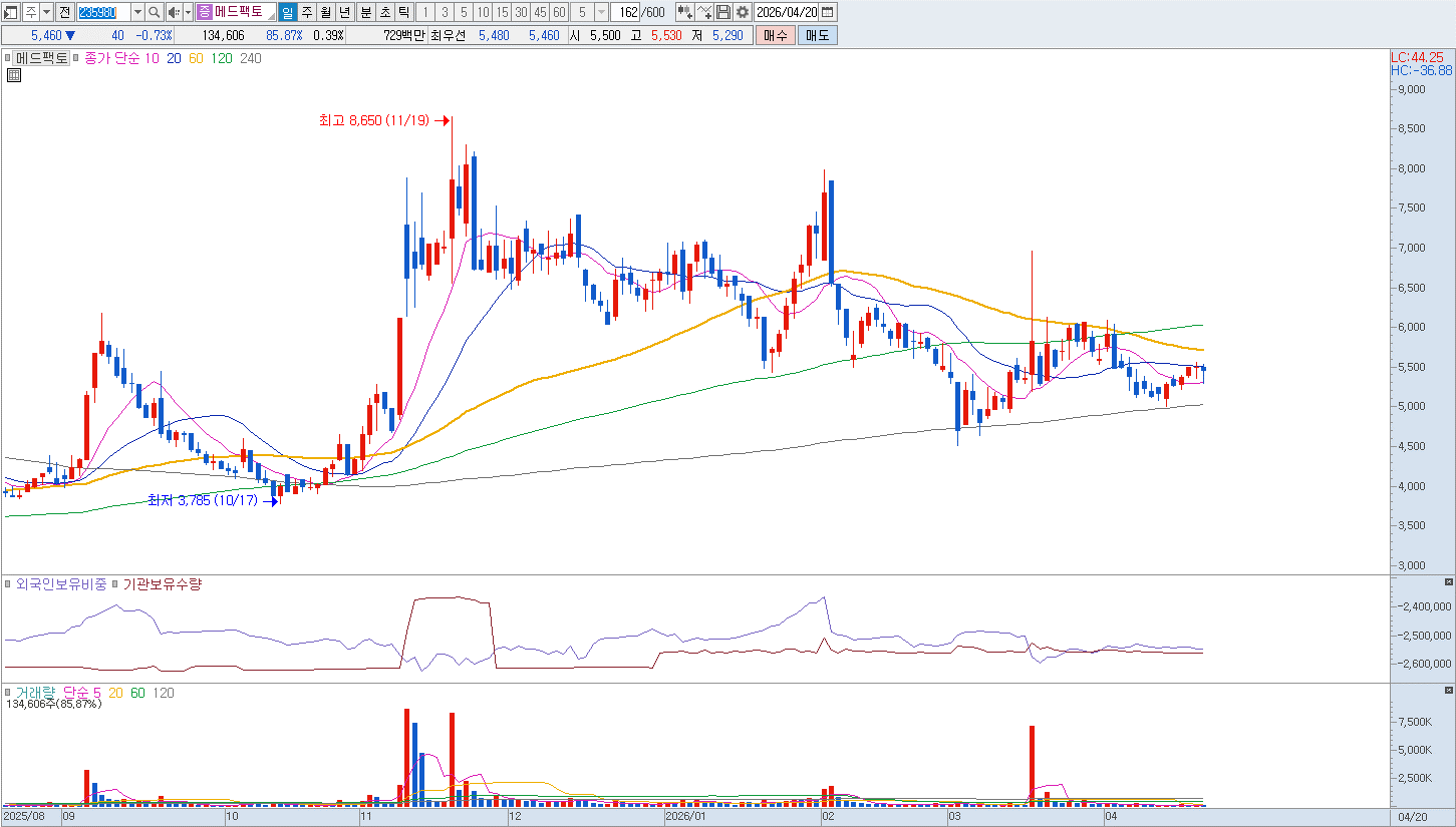 바이오차이나 2026 등 글로벌 무대에서 적극적인 파트너링을 이어가며 기술력을 입증하고 있는 메드팩토는, 신약 개발이라는 험난한 과정 속에서도 가시적인 임상 데이터를 통해 대한민국 바이오 산업의 저력을 보여주고 있습니다. 반등시마다 비중 축소 의견입니다. |